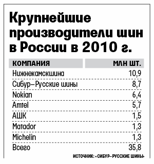 До сих пор Pirelli была практически незаметна в России. Ее рекорд – 2% рынка в 2007 и 2008 гг. Но благодаря амбициозным планам компания может вырваться в лидеры рынка. Сейчас крупнейшие производители шин в России – «Нижнекамскшина», «Сибур – русские шины» и Nokian Tyres (см. график). Но первые две ничего не сообщали о намерении увеличивать мощности. Лишь Nokian Tyres недавно объявляла о намерении построить в России еще один завод, увеличив свои совокупные мощности в 1,75 раза до 14 млн штук.