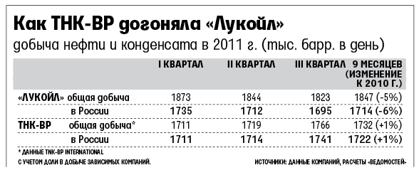 По итогам девяти месяцев добыча ТНК-ВР пока больше, чем у «Лукойла», лишь в пересчете на баррели (с учетом разной плотности нефти компаний). А вот в III квартале «Лукойл» немного уступил даже при расчете в тоннах: он добыл 21,28 млн т против 21,29 млн у ТНК-ВР. У последней добыча в России за минувший квартал выросла на 1,3% к прошлогоднему уровню и на 1,6% ко II кварталу. А у «Лукойла» 5,9 и 1% падения соответственно.