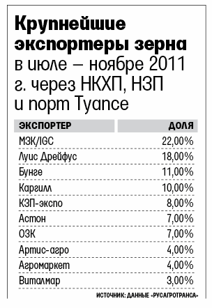 800 000 т ОЗК – это примерно 4,5% российского экспорта исходя из данных «Русагротранса», согласно которым до конца 2011 г. экспорт зерновых ожидается в пределах 17,5–17,8 млн т. В том числе через крупнейшие порты – Новороссийск и Туапсе будет экспортировано 7,7 млн т, или около 45% (в этих портах ОЗК контролирует сейчас 7% экспорта, см. таблицу).