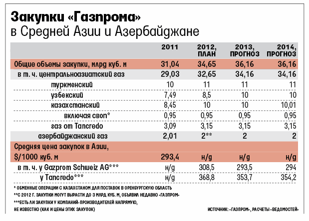 Из документов следует, что в 2012–2014 гг. «Газпром» намерен закупать газ у компании Tancredo на территории Средней Азии примерно на $1 млрд ежегодно. Причем каждая 1000 куб. м этого газа будет на $60 дороже, чем сырье, которое «Газпром» берет в том же регионе у собственной «дочки» Gazprom Schweiz AG (см. таблицу). Такая разница может приносить Tancredo по $190 млн прибыли ежегодно. Сколько при этом стоит газ самих производителей – национальных компаний, не известно. Есть ли вообще прямые договоры между ОАО «Газпром» и компаниями-производителями, также никогда не раскрывалось.