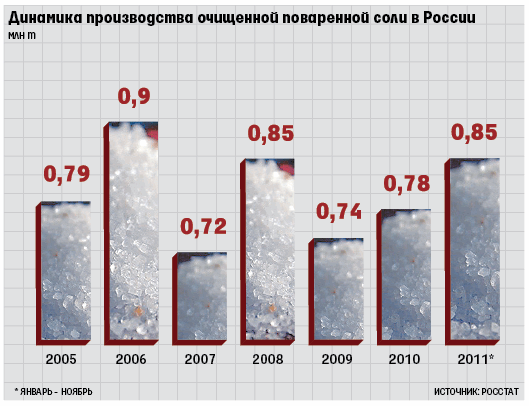 Украина – крупнейший поставщик соли в Россию, следует из данных таможенной статистики. По данным Федеральной таможенной службы, в 2010 г. Россия импортировала 1,26 млн т каменной и поваренной соли для пищевых и промышленных нужд на $67,15 млн. Из них на поставки с Украины пришлось 1,22 млн т на $51,62 млн. По данным таможенной службы Украины, экспорт соли в Россию в 2010 г. в денежном выражении составил $46,88 млн, в натуральном выражении – 1,2 млн т, за 11 месяцев этого года – $51,9 млн (1,3 млн т).