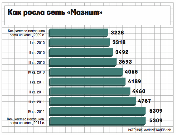 Выручка «Магнита» за 2011 г. увеличилась на 42,1% до 335,6 млрд руб., сообщила компания. Продажи сети оказались ниже прогнозов менеджмента: в августе 2011 г. гендиректор «Магнита» Сергей Галицкий говорил, что ожидает роста продаж сети на 43–48%, а в начале года говорил о 50%. Но Галицкий не считает итоговый результат просчетом. «С точки зрения роста сети мы считаем этот год очень успешным. В августе Минэкономразвития ожидало, что продовольственная инфляция по итогам года будет на уровне 6–6,5%, мы исходили из этого показателя. Но в реальности вышла рекордно низкая цифра – всего 3,9%. Если бы инфляция в этом году была такой же, как в прошлом, т. е. 12%, выручка выросла бы больше чем на 50%. Ни один ритейлер в мире с сопоставимым оборотом не показывает такой динамики», – объяснил он «Ведомостям».