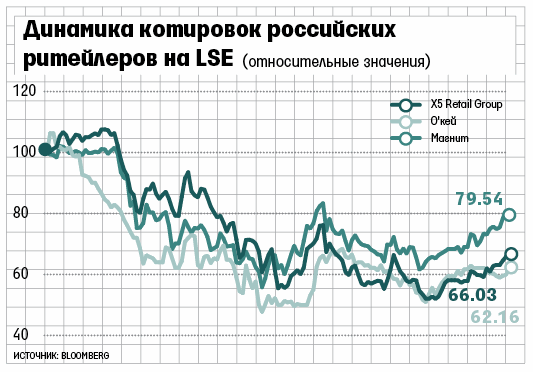 Инвесторов прогнозы Лонге, по всей видимости, обнадежили: бумаги «О’кей» на Лондонской бирже подорожали на 3,9% до $6,91 за штуку, в то время как «Магнит» потерял 1,1%, а Х5 выросла на 0,5%. «О’кей» в ходе IPO продавала акции по $11, к июлю 2011 г. они даже подросли в цене – до $11,8, но после публикации полугодовых результатов, когда компания отчиталась о росте выручки на 12%, котировки начали снижаться и к началу октября акции стоили вдвое дешевле, чем на IPO, – $5,4.