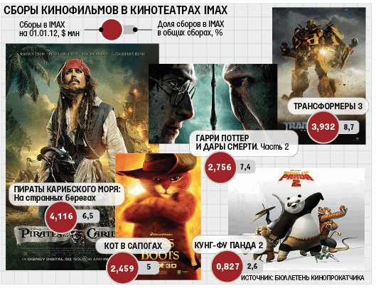 Самым кассовым в России фильмом в формате IMAX в прошлом году, по данным журнала «Бюллетень кинопрокатчика», были «Пираты Карибского моря: На странных берегах» – $4,1 млн, или 6,5% общей кассы фильма. Всего в прошлом году в России и СНГ в формате IMAX вышел 21 фильм, зрители потратили на билеты в залы IMAX $31,2 млн (общие сборы – $1,2 млрд), что в полтора раза больше, чем в 2010 г. Россия – третий по числу залов рынок IMAX в мире после США и Китая. В ближайшие два года в СНГ будет открыто еще 22 зала в этом формате, рассказал Фостер. Рынок растет и появляется спрос на фильмы местного производства, указывает он.
