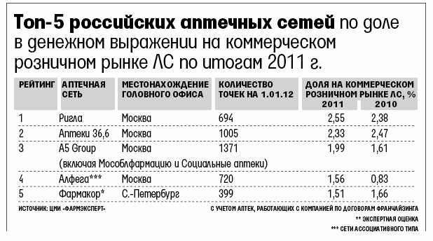 На аптечном рынке сменился лидер: по итогам 2011 г. аптечная сеть «Ригла» продала больше лекарств, чем «36,6», подсчитал центр маркетинговых исследований «Фармэксперт»
