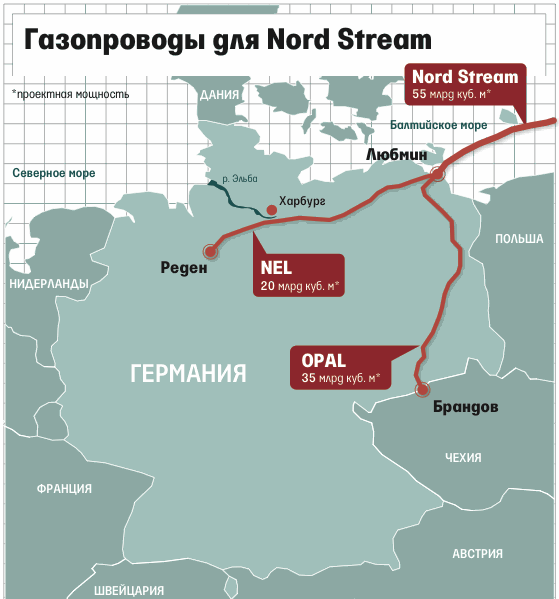 О задержке в строительстве NEL сообщило агентство Dow Jones, ссылаясь на представителей германской E.On Ruhrgas. Укладка газопровода началась прошлой весной, сдать его планировалось в конце 2012 г. Как раз к тому моменту должна заработать вторая ветка «Северного потока», что увеличит мощность российской трубы до 55 млрд куб. м в год. Первая ветка «Северного потока», заработавшая в 2011 г., сейчас соединена с германской системой OPAL, идущей в сторону Чехии (см. карту). Мощность OPAL – 35 млрд куб. м в год. Еще 20 млрд должен обеспечить NEL.