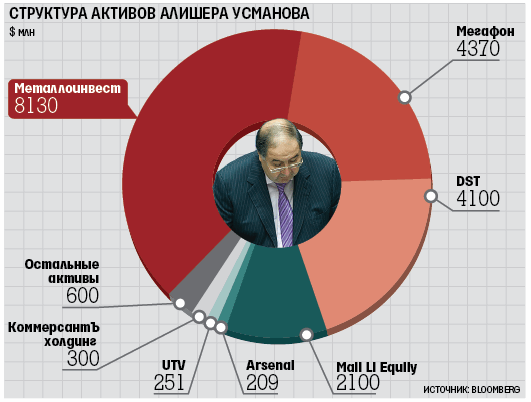 По данным Bloomberg, первенство Усманову обеспечил главным образом рост стоимости его пакета в Facebook, который сейчас превышает $4 млрд (список всех активов Усманова см. на стр. 01). С момента покупки в 2010 г. 5,5% акций Facebook, которые Усманов контролирует через DST, стоимость этого пакета выросла в 9 раз. Усманову принадлежит в DST 80% акций.