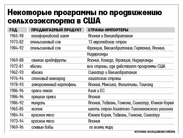 В США действуют десятки ассоциаций, защищающих интересы сельхозпроизводителей, в том числе за рубежом. Правительство страны ежегодно направляет на поддержку экспортеров сотни миллионов долларов. Эти траты возвращаются сторицей: отдача от расходов на продвижение гораздо больше вложений