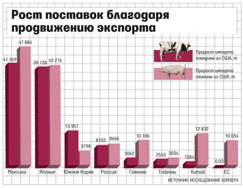 Меры по продвижению экспорта позитивно отражаются и на доходах производителей говядины и свинины, утверждает Кэйзер. В 2001–2010 гг. в среднем благодаря экспортной политике чистые доходы производителей говядины выросли от $21,7 млн до $90,9 млн в год, доходы производителей свинины – от $39,9 млн до $169,7 млн в год.