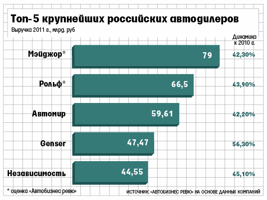 Журнал «Автобизнес ревю» составил очередной рэнкинг крупнейших автодилеров. В 2011 г. выручка 60 крупнейших компаний от продажи новых автомобилей составила 780 млрд руб. без учета НДС (или около $26 млрд по курсу 30 руб. за доллар), что на 53% выше, чем в 2010 г. При этом их общая выручка – с учетом сервиса, продаж автомобилей с пробегом и прочих услуг – за прошлый год выросла только на 46%, составив почти 978 млрд руб. Причина тому – медленный рост доходов от сервиса и продажи запчастей из-за снижения гарантийного парка, указали эксперты «Автобизнес ревю».