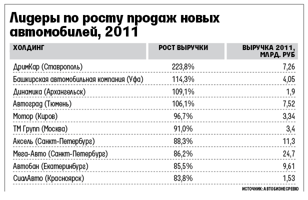 Региональные дилеры продемонстрировали лучшую динамику – как по росту продаж в штуках, так и по выручке, чем федеральные и столичные компании, отмечает Баранов. Продажи быстрее росли в регионах, так как там они сильнее упали в кризис. Абсолютным лидером роста выручки стала ставропольская компания «Дрим кар», увеличившая за год свои продажи на 211% до 7,26 млрд руб. Тут тоже сказался эффект низкой базы – в 2010 г. холдинг проводил реструктуризацию кредитного портфеля, а весь прошлый год восстанавливал продажи, объясняют эксперты «Автобизнес ревю». Правда, своей докризисной выручки в 14 млрд руб. «Дрим кар» далеко не достигла.