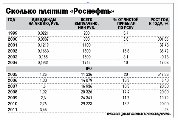 Акционеры «Роснефти» могут рассчитывать на рекордные дивиденды по итогам 2011 г.: совет директоров рекомендовал направить на выплаты 36,564 млрд руб. (3,45 руб. на акцию), сообщила компания. Это на 25% больше, чем годом ранее, и рекорд для «Роснефти» как по темпам роста выплат, так и в их абсолютном выражении (см. врез).