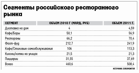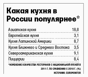 Формат, ранее занимавший нишу высокой кухни, сейчас «вышел в народ», рассуждает представитель Ginza Project. Он напоминает, что в конце 2011 г. компания открыла сеть кафе «Оки доки» (сейчас восемь точек). «Планета гостеприимства» говорит о серьезных объемах бизнеса, при таком размахе главное – не потерять контроль за качеством еды и уровнем сервиса, предупреждает он. Число предприятий азиатской кухни в прошлом году в России росло быстрее, чем каких-либо других, за год их стало больше на 18%, свидетельствуют данные консалтинговой компании Euromonitor. При этом быстрее всего на ресторанном рынке, общий объем которого Euromonitor оценивает в 508,4 млрд руб., развивался именно сегмент фастфуда, сейчас он занимает почти половину рынка (см. врез).