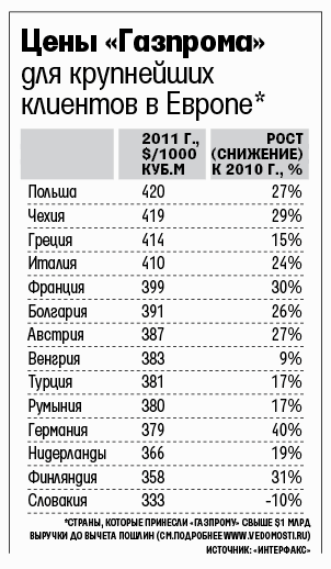 В 2011 г. самый высокий рост цен пришелся на Германию, гласят данные «Интерфакса» (см. таблицу). Крупнейший импортер этой страны – E.On Ruhrgas – сейчас ведет арбитражную тяжбу с «Газпромом» на 1,5 млрд евро о пересмотре условий контракта.