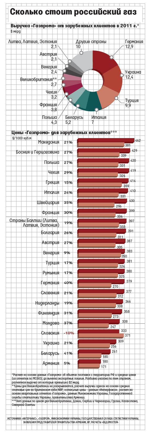 Цена, конечно, не самая высокая в мире: по итогам 2011 г. она составила порядка $309, а без учета «харьковской» скидки (снижение цены за счет льготной пошлины по соглашению о Черноморском флоте от апреля 2010 г.) получилось бы $409. Как минимум у пяти клиентов «Газпрома» – Македонии, Боснии и Герцеговины, Польши, Чехии и Греции – цена была выше этого уровня. Но с учетом масштабов Украина теперь второй по доходности рынок для «Газпрома» после Германии.