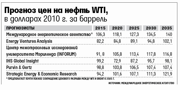 Несмотря на понижательный тренд в краткосрочных нефтяных прогнозах аналитиков (Brent – $105,1 за баррель в 2013 г. и $104,5 в 2014 г., для WTI – $96,6 и $100,1 соответственно, консенсус Reuters), минэнерго CША не ожидает снижения нефтяных котировок в долгосрочной перспективе. Базовый сценарий ведомства предполагает рост цены нефти WTI с $79 за баррель в 2010 г. до $117 в 2015 г., до $127 в 2020 г. и до $145 к 2035 г. Разрыв средней цены барреля WTI и Brent в 2011 г. составил $17,3 (данные Bloomberg).