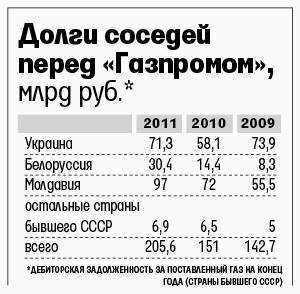 За прошлый год «Газпром» не только получил максимальную выручку, но и поставил рекорд по долгам стран – бывших соседей по СССР. К концу 2011 г. их задолженность за поставленный газ превысила $6 млрд
