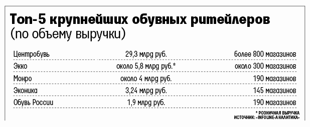 По данным Национального обувного союза, российский рынок обуви малоконсолидирован, на долю крупнейшей розничной сети «Центробувь» едва приходится 3% (см. таблицу). В 2012 г. объем рынка будет 900 млрд руб. (в розничных ценах, включая НДС), львиную долю составит импорт, прогнозирует гендиректор «Infoline-аналитики» Михаил Бурмистров. Огромная часть рынка серая: по данным обувного союза, в 2011 г. в России было продано 500–560 млн пар, при этом, по официальным данным, в России производится всего 55 млн пар и импортируется около 300 млн пар.