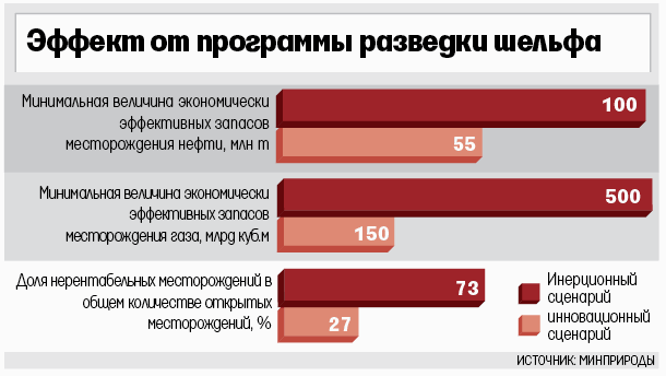 Чтобы стимулировать разведку и добычу на шельфе, Минприроды предложило правительству инновационный сценарий — допустить частные компании к геологоразведке (но не к добыче) без участия госкомпаний, а налоговую и таможенную нагрузку менять в зависимости от сложности месторождения (см. врез).