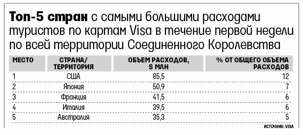 Столица Игр уже получила от туристов около $700 млн. Самыми расточительными стали представители США, Японии и Франции (см. таблицу). Ранее Visa прогнозировала, что в течение семи недель Олимпийских и Паралимпийских игр Великобритания заработает $1,2 млрд. Для сравнения: на зимних Играх в Ванкувере за все время Игр туристы оставили $115 млн, из которых россиянами было потрачено $4,3 млн (они стали четвертыми среди иностранных гостей Игр).