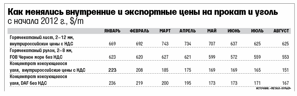 Мировые тенденции дошли и до российского рынка. Цены на горячекатаный прокат (на условиях FOB Черное море) достигли годового минимума (см. таблицу), упав за прошлую неделю на 1,8%. На 11,6 и 11,3% подешевели коксующийся уголь и железная руда соответственно, подсчитали аналитики БКС.