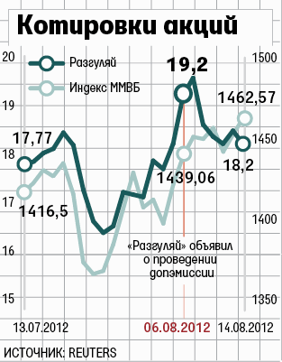 Акционеры «Разгуляя», воспользовавшись преимущественным правом, выкупили 70 512 (0,044% от текущего уставного капитала и 0,037% от увеличенного) новых акций группы, сообщила она вчера. Цену размещения совет директоров утвердил 6 августа – 35 руб. за акцию, на момент объявления она была почти вдвое выше рыночной (19,2 руб. на момент закрытия торгов на ММВБ-РТС). Таким образом, акционеры согласились выкупить бумаг на 2,5 млн руб. Общий объем утвержденной допэмиссии – 31,906 млн бумаг, т. е. неразмещенными остались 31,836 млн (на 1,1 млрд руб.). Если допэмиссия будет полностью размещена, то ее объем составит 16,8% от увеличенного уставного капитала.