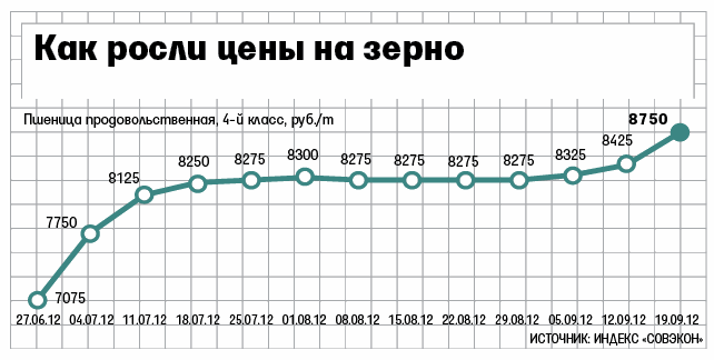 Цены этой недели в Новороссийске – абсолютный максимум за всю постсоветскую историю, сказал гендиректор ИКАР Дмитрий Рылько. Небывало высокие уровни цен установились с самого начала этого зернового года (с 1 июля), когда стало ясно, что из-за засухи урожай не будет высоким: если в мае чиновники говорили об урожае не хуже прошлогоднего (94,3 млн т), то вчера премьер Дмитрий Медведев сказал лишь, что он будет более 70 млн т. К этому добавилась неблагоприятная ситуация на внешних рынках: в США и Европе тоже сильная засуха.