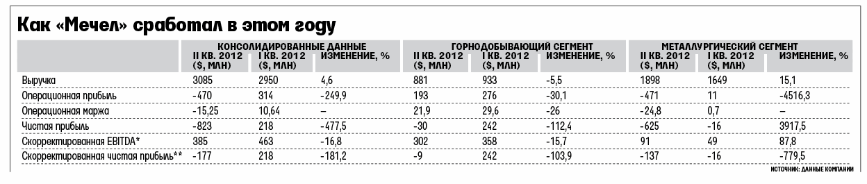Вчера «Мечел» объявил финансовые показатели по US GAAP за II квартал и первое полугодие (см. таблицу). Оказалось, что за апрель – июнь компания получила $823 млн чистого убытка. В итоге за первое полугодие этот показатель составил $605 млн по сравнению с чистой прибылью в $501 млн за аналогичный период 2011 г. Потери должны были быть в 10 раз меньше – около $60 млн, удивлен аналитик Societe Generale Сергей Донской.