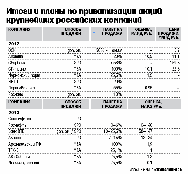 Утвержденная Дмитрием Медведевым программа приватизации предусматривает переход в частные руки к 2016 г. 12 крупных компаний, в том числе «Роснефти», ВТБ, «Русгидро», «Аэрофлота», а также частичную приватизацию РЖД, «Транснефти» и других госактивов. Но отсутствие конкретных сроков продажи ставило под сомнение выполнение программы.