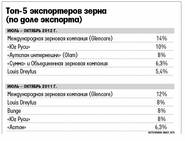 Согласно таможенной статистике, второе и третье места в списке крупнейших зерновых экспортеров в июле — октябре 2012 г. заняли «Юг Руси» и российская «дочка» сингапурской Olam — компания «Аутспан интернешнл» (см. врез). Список лидеров по итогам всего сельскохозяйственного года (июль 2012 г. — июнь 2013 г.) вряд ли будет отличаться — основной объем зерна уже вывезен. Прогноз экспорта на весь год (июль 2012 г. — июнь 2013 г.) — 10-12 млн т, а за июль — октябрь вывезено 10,3 млн т (в обоих случаях — данные Минсельхоза).