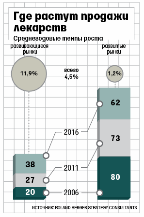 Другой вариант – выход на развивающиеся рынки, указывают аналитики Roland Berger. К 2016 г. они вырастут почти на 12%, в среднем же рынок будет расти на 4,5% ежегодно; на долю развивающихся рынков придется около 40% мирового фармрынка, говорится в исследовании. Сегодня не американские, не японские и не европейские регионы генерируют 60% глобального экономического роста, он формируется в основном странами БРИК и проч., отметил в интервью «Ведомостям» Ясутика Хасегава, президент и главный исполнительный директор Takeda Pharmaceutical Company. «Если компании нет в этих странах, она теряет возможность развития», – резюмировал Хасегава.