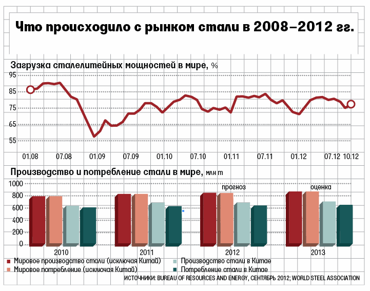 Компаниям надо сокращать мощности, говорится в исследовании. Спрос на сталь в 2013 г. вряд ли значительно вырастет: экономический кризис в развитых странах продолжается, китайская экономика переживает структурный сдвиг. Восстановления можно ожидать в 2014–2015 гг.