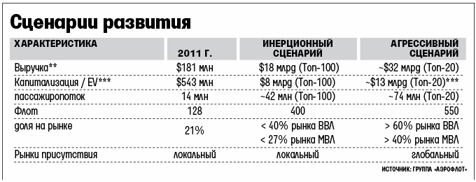 Завтра совет директоров «Аэрофлота» обсудит поправки в стратегию развития авиакомпании до 2025 г., рассказали «Ведомостям» два источника, близких к перевозчику и его совету директоров. Документ был утвержден в июле 2011 г. Стратегия предусматривала два варианта развития авиакомпании – инерционный и агрессивный. По первому из них «Аэрофлот» должен был расти вместе с рынком и остаться локальным перевозчиком. Этот вариант предусматривал рост пассажиропотока компании за 14 лет втрое – до 42 млн человек (см. таблицу на стр. 13). Но совет директоров выбрал агрессивный вариант. По нему компания должна превратиться в глобального перевозчика, а ее пассажиропоток – вырасти в 5 раз до 74 млн человек.