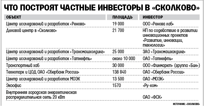 «Ренова» начала строить лабораторию на 19 000 кв. м, компания объявляла, что инвестиции составят 2 млрд руб. Сбербанк собирается построить технопарк и центр обработки за 14,1 млрд руб. Около 12 млрд руб. вложит ФСК в строительство двух подстанций. Подписан меморандум о строительстве здания корпоративного исследовательского центра «Трансмашхолдинга» (ТМХ), который будет разрабатывать новый подвижной состав. Планируется, что R&D центр ТМХ станет самым большим исследовательским центром в «Сколково» – 25 000 кв. м. Представитель ТМХ сообщил, что стоимость проекта еще рассчитывается. ФСК построила подземную подстанцию на 500 кВт, планируется еще одна. По словам Маслакова, ведутся переговоры с «Интер РАО» о строительстве R&D-центра площадью 10 000 кв. м и МОЭК, которая хочет разместить экспериментальное производство на 7000 кв. м. Транспортный хаб (30 000 кв. м, 4 млрд руб.), который построят структуры Михаила Гуцериева, станет центральным входом на территорию «Сколково», там будет осуществляться пересадка на внутренний общественный транспорт ИЦ «Сколково».