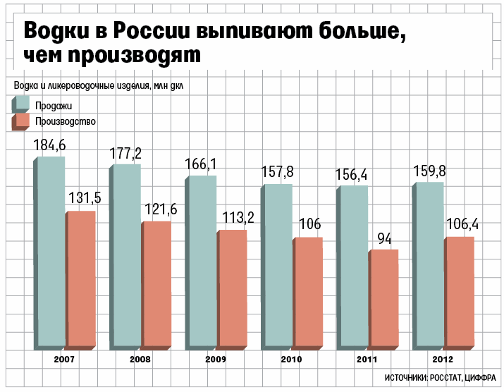 Водки в России традиционно выпивается больше, чем легально производится, – разницу составляет в основном контрафакт (см. рисунок). А рост акцизов, запланированный на ближайшие годы, может усугубить ситуацию. Сейчас минимальная розничная цена пол-литровой бутылки – 170 руб., из которых 80 руб. приходится на акциз, рассказывает член совета директоров «Русского алкоголя» Игорь Косарев. В 2014 г. акциз будет 100 руб., в 2015 г. – 120 руб. Чем больше сумма, рассуждает Косарев, тем больше вероятность, что нелегалы переключатся с малоизвестных водок на подделку популярных брендов.