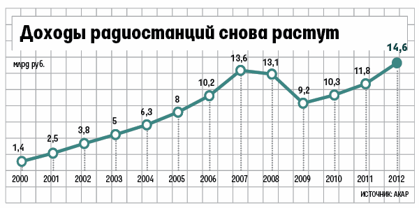 «Вещательная корпорация Профмедиа» (ВКПМ) управляет радиостанциями «Авторадио», Energy, «Юмор FM» и «Радио Romantika», ее выручка в 2011 г. составила 1,8 млрд руб. (отчетность за прошлый год еще не опубликована). Для сравнения: выручка ЕМГ в 2011 г. составила 2,2 млрд руб. Всего в 2011 г. рекламодатели потратили на продвижение в радиоэфире 11,8 млрд руб. (данные Ассоциации коммуникационных агентств России), соответственно, ВКПМ контролирует около 15% этого рынка, ЕМГ – 18,6%. Это два крупнейших радиохолдинга страны.