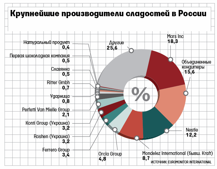 «Объединенные кондитеры», по данным Euromonitor International, – второй по выручке производитель кондитерских изделий в России после Mars (см. график) с долей рынка 15,6%. Компания объединяет 15 фабрик, в том числе московские «Красный Октябрь», «Рот Фронт» и «Бабаевский». Euromonitor оценивает выручку «Объединенных кондитеров» за 2012 г. почти в $1,97 млрд. Продажи компании за прошлый год составили около $1,7 млрд, говорит близкий к «Гуте» источник.