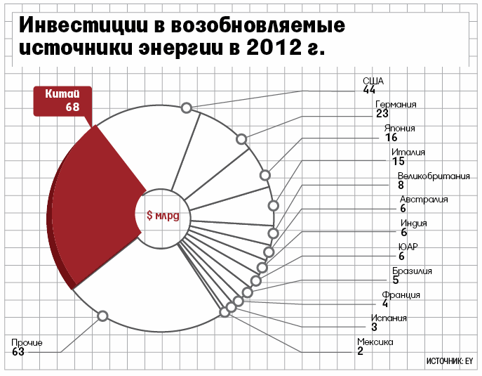 Но сланцевый газ – не единственная проблема альтернативной энергетики, констатирует EY. Развитые страны, которые наращивали инвестиции в возобновляемые источники энергии до кризиса, теперь сосредоточились на фискальной консолидации. В 2012 г. лидером по объему вложений в альтернативную энергетику стал Китай (см. график).