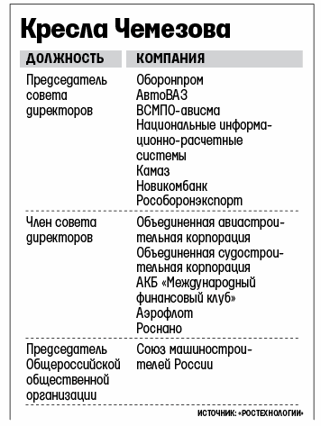 Чемезов становится популярным директором, отмечает аналитик Raiffeisenbank Андрей Полищук. Глава «Ростеха» входит в советы директоров 12 компаний, из которых возглавляет семь (см. таблицу). Большинство из них связано с «Ростехом». Кроме того, он номинирован в качестве независимого кандидата в совет директоров «Норникеля». «У Чемезова большой опыт работы с иностранцами на совместном предприятии «АвтоВАЗа», у которого их уже семеро в нынешнем совете директоров», – говорит ведущий аналитик компании «Альпари» Михаил Крылов.