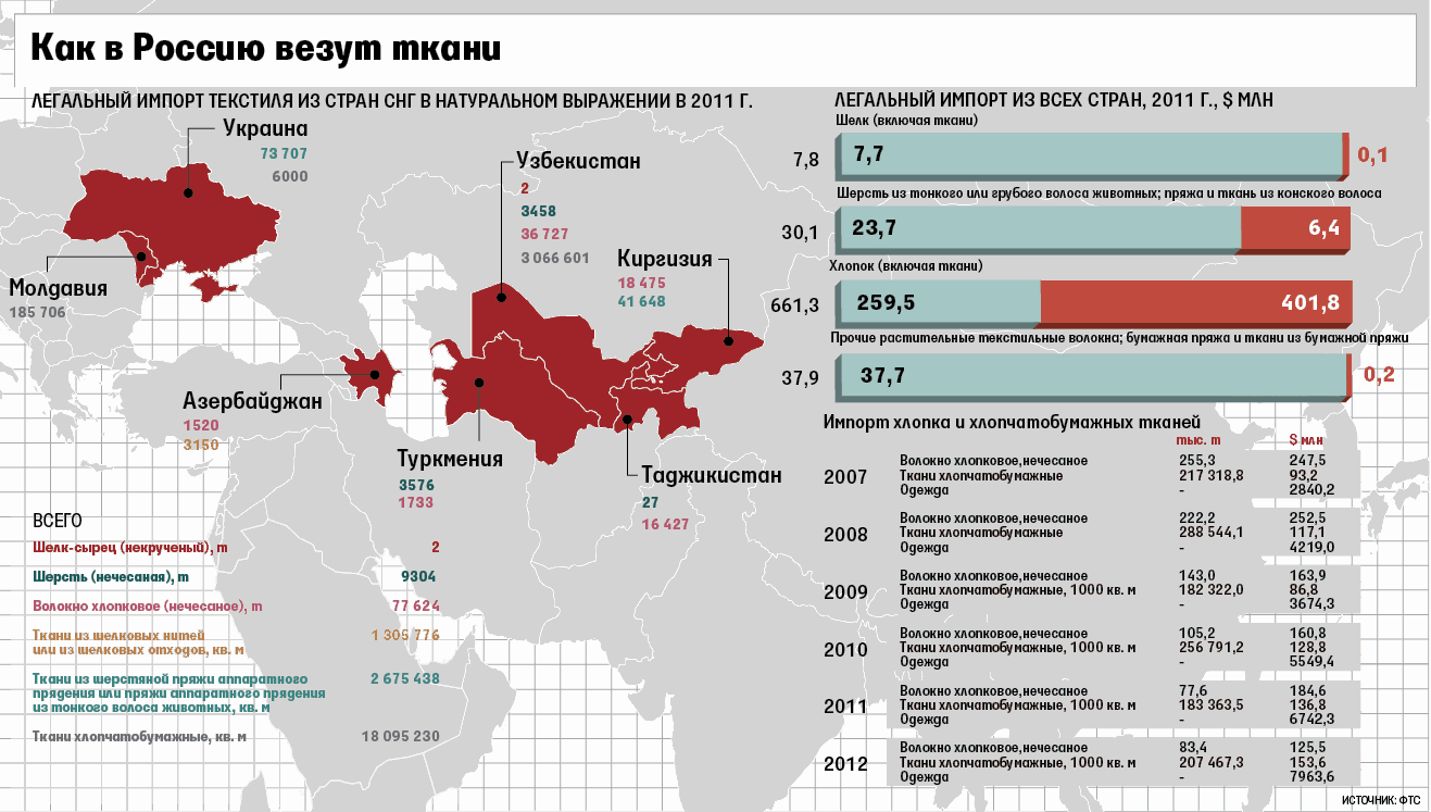 Производители тканей, а следом за ними и готовой одежды, судя по всему, больше озабочены борьбой с контрафактом, чем переводом производств в Россию: примерно треть рынка продукции легкой промышленности, по заявлению Путина, занимают «незаконно произведенные и нелегально ввезенные товары» (по подсчетам Мантурова, бюджет из-за контрафакта недополучает 200 млрд руб. налогов в год). При этом из всего рынка продукции легпрома в 2,8 трлн руб. (эта цифра включает обувь и т. п.) на российские товары, по словам президента, приходится всего четверть.