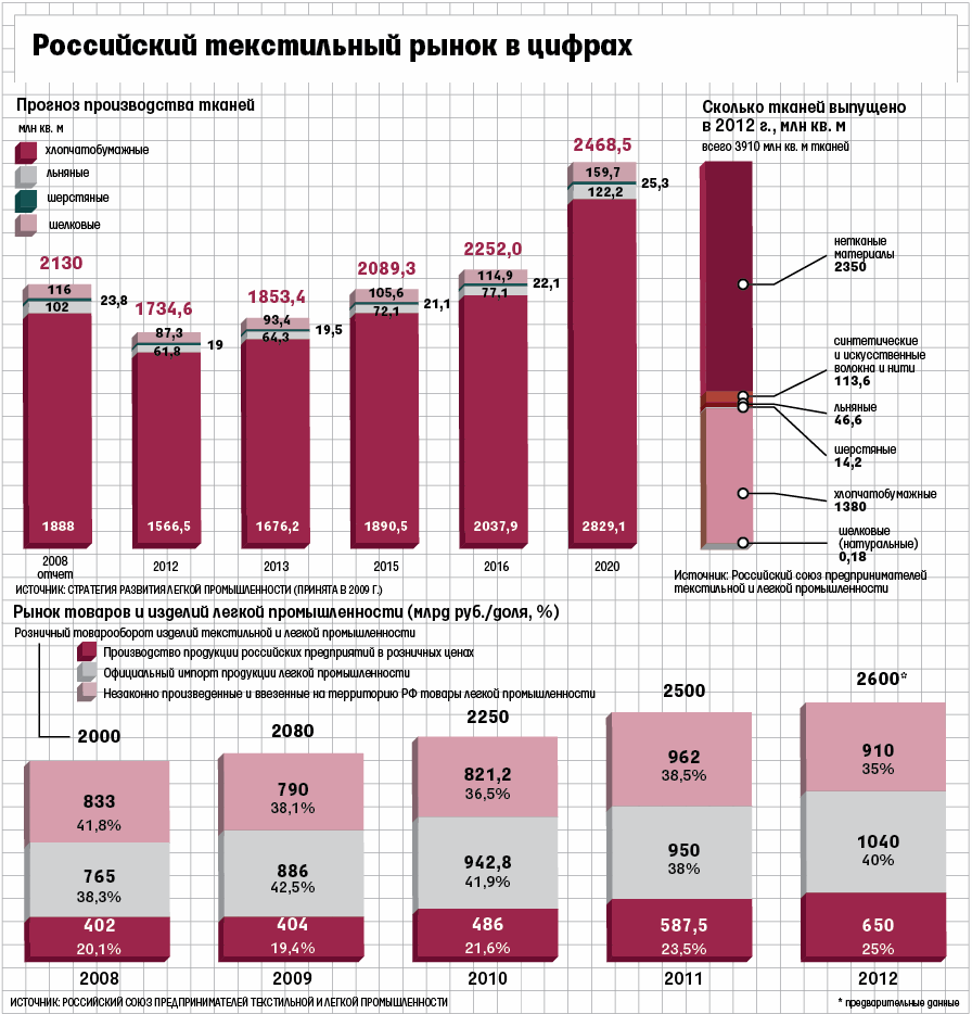 В 2008 г. в России было произведено, по данным Минпромторга, 2,13 млрд кв. м ткани. Даже инновационный сценарий развития отрасли, изложенный в стратегии, предполагал снижение объема производства: в 2010 г. он должен был составлять 1,7 млрд кв. м, а на уровень 2008 г. вернуться только в 2016 г. В 2012 г., по расчетам министерства, в стране должно было быть произведено 1,6 млрд кв. м хлопчатобумажных тканей, 61,8 млн кв. м льняных, 19 млн кв. м шерстяных и 87,3 млн кв. м шелковых тканей (подробнее см. таблицу). Но, судя по данным Российского союза предпринимателей текстильной и легкой промышленности, реальное производство в прошлом году до плановых показателей не дотянуло: в 2012 г. произвели 84 500 т хлопчатобумажной пряжи и 1,4 млрд кв. м ткани, 7500 т шерсти и 14 млн кв. м ткани, 5800 т льняной пряжи и 46,5 млн кв. м ткани.