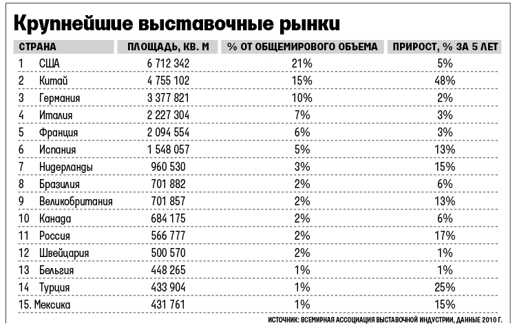 Если считать квадратные метры, то получится, что 80% современных выставочных площадей расположено в 15 странах. В тройке лидеров – США с 6,7 млн кв. м (21%), Китай с 4,76 кв. м (15%) и Германия (3,38 кв. м, 10%). Россия – на 11-м месте с 566 777 кв. м площадей, подходящих для проведения крупных выставок (2%).