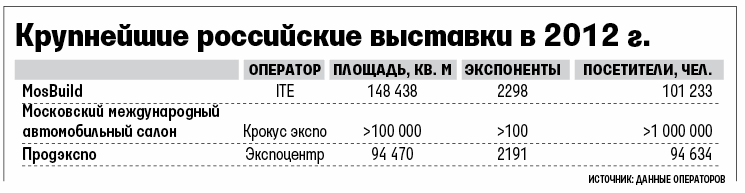 Лидирующий в Поволжье оператор «Нижегородская ярмарка» за 2012 г. провел 37 выставочных мероприятий с 5364 участниками, но по сравнению с 2011 г. количество выставок, площадей и участников не изменилось, сообщила пресс-служба компании. «СОУД – Сочинские выставки» провела всего лишь на одну выставку больше. В 2011 г. выставки ITE в России посетили более 860 000 человек, в 2012 г. их было около 780 000, говорит Шталенков. Снижение количества посетителей он объясняет тем, что некоторые выставки компания проводит раз в два года и в 2012 г. они не проходили.