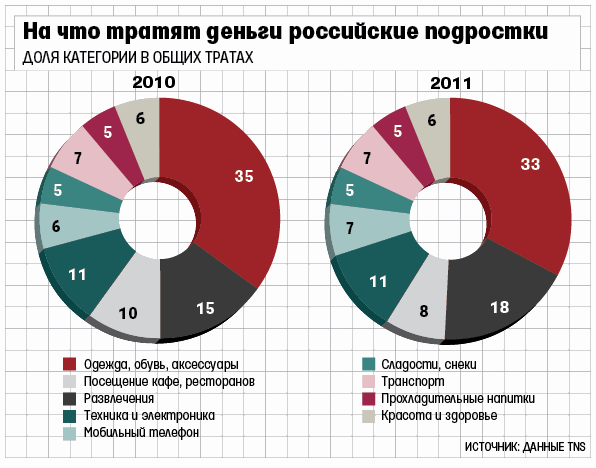 С 2010 г. траты подростков выросли в 2 раза: тогда, по данным TNS, их расходы составляли $3,8 млрд, в 2011 г. – $4,1 млрд. У мальчиков расходы выше: еженедельно они тратят 809 руб. (+125% к 2011 г.), а девочки – лишь 621 руб. (+41%).
