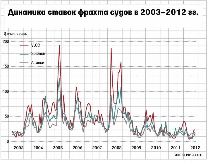Снижение оценки «Совкомфлота» связано в том числе и с тем, что ставки фрахта, упав в 2008 г. в 2 раза до $25 000–50 000 в день, так и не восстановились, подчеркивает гендиректор агентства Infranews Алексей Безбородов (см. график). Скопилось слишком много не занятых в перевозках судов и из-за переизбытка предложения даже Fesco вынуждена была продать половину флота, чтобы не тратиться на его содержание, уточняет Безбородов.
