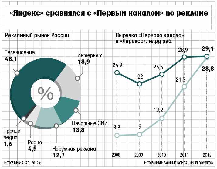 «Яндекс» и «Первый», конечно, работают с разными форматами рекламы, но в конечном итоге они продают одно и то же – коммуникацию с потенциальным потребителем, поэтому сравнение между ними как медиа совершенно корректно, считает гендиректор TNS Руслан Тагиев. В рунете более высокая концентрация денег, чем на ТВ, в том числе и поэтому «Яндекс», работая на втором по величине рекламном рынке, смог догнать абсолютного лидера, говорит он. «Яндекс» контролирует половину онлайн-рекламы в стране, «Первый» – только 20,1% эфирной телерекламы (расчеты «Ведомостей» на базе данных АКАР).