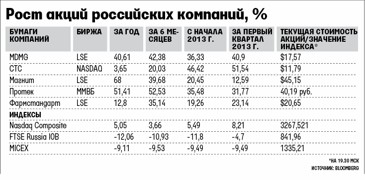 С начала 2013 г. ко вчерашнему вечеру бумаги CTC Media подорожали на 46,42%, MDMG (управляет сетью клиник «Мать и дитя») – на 36,33%, фармацевтическая группа «Протек» прибавила на ММВБ 35,48%. Новый лидер российской розницы «Магнит» с начала года прибавил в Лондоне 20,45%, а производитель лекарств «Фармстандарт» на той же бирже – 19,26% (подробнее см. таблицу). Из ликвидных российских бумаг, судя по данным Bloomberg, акции и расписки потребительских компаний подорожали заметнее всего.