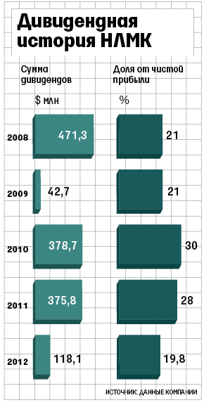 НЛМК – не единственная компания из пятерки лидеров металлургической отрасли, которая решилась платить дивиденды по итогам 2012 г. «Северсталь» заплатит за 2012 г. $304 млн (это 37% от чистой прибыли), напоминает представитель компании. Остальные компании – Evraz, «Мечел» и ММК – в 2012 г. ушли в убыток и рекомендовали акционерам не платить дивиденды. Лишь «Мечел» заплатит владельцам привилегированных акций (25% капитала) не более 7,5 млн руб., чтобы эти акции не конвертировались в обыкновенные, раскрывала компания в отчете за 2012 г.