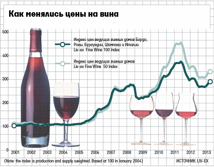 Согласно индексу Liv-ex 100, который рассчитывается на основе средних цен ведущих винных домов Бордо, Бургундии, Роны, Шампани и Италии, максимума цены на вино достигли в июне 2011 г., а к октябрю 2012 г. упали на 29%. С того времени индекс вырос на 8% (см. график).