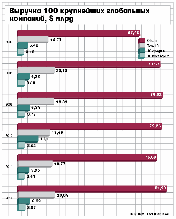 Тучные годы для консультантов прошли. Выручка 100 крупнейших международных юрфирм (ILF), по данным The American Lawyer, почти не увеличилась с 2008 г. в номинальном выражении, а в реальном – даже упала (см. график). Выручка же топ-10 немного снизилась даже в номинальном выражении.
